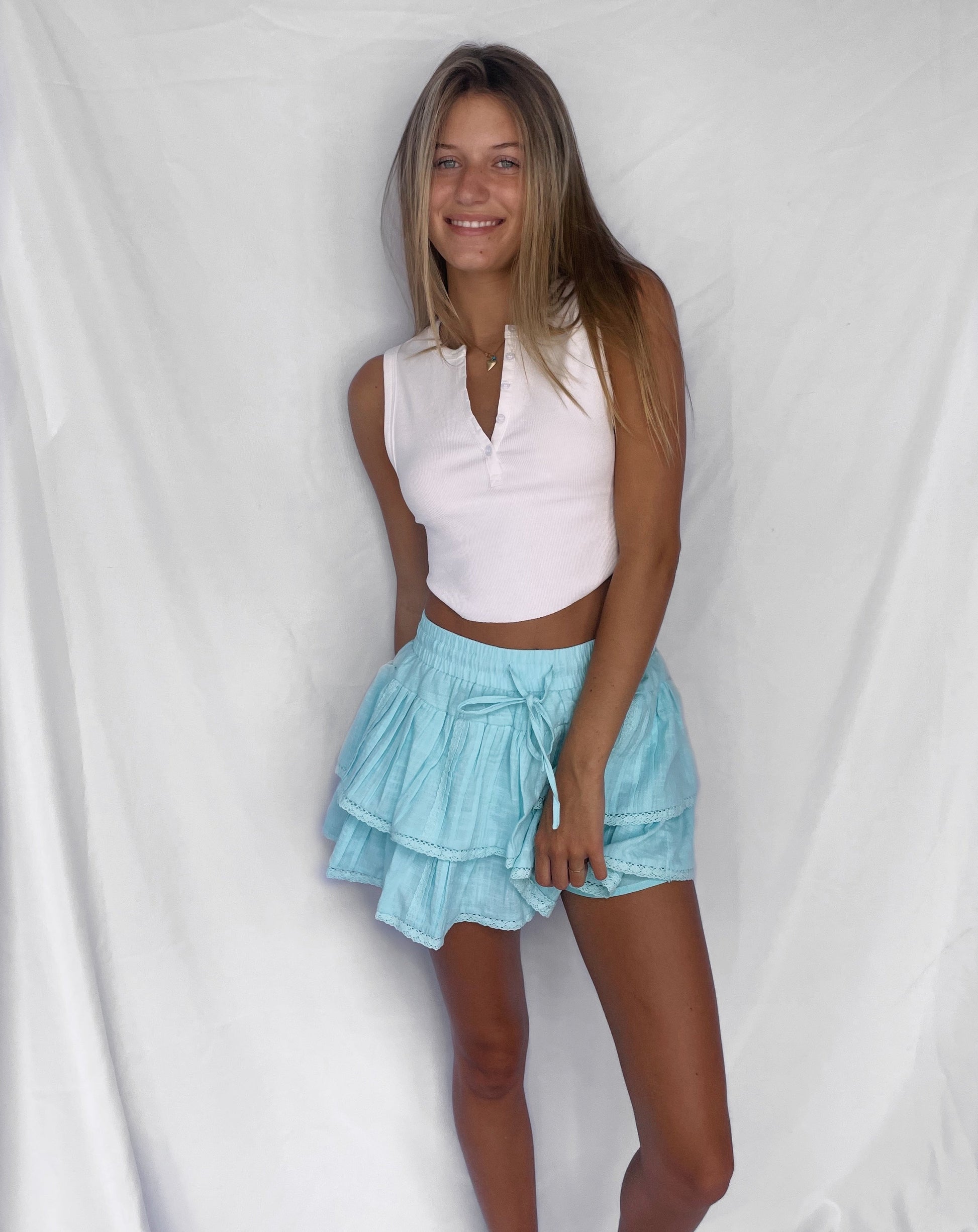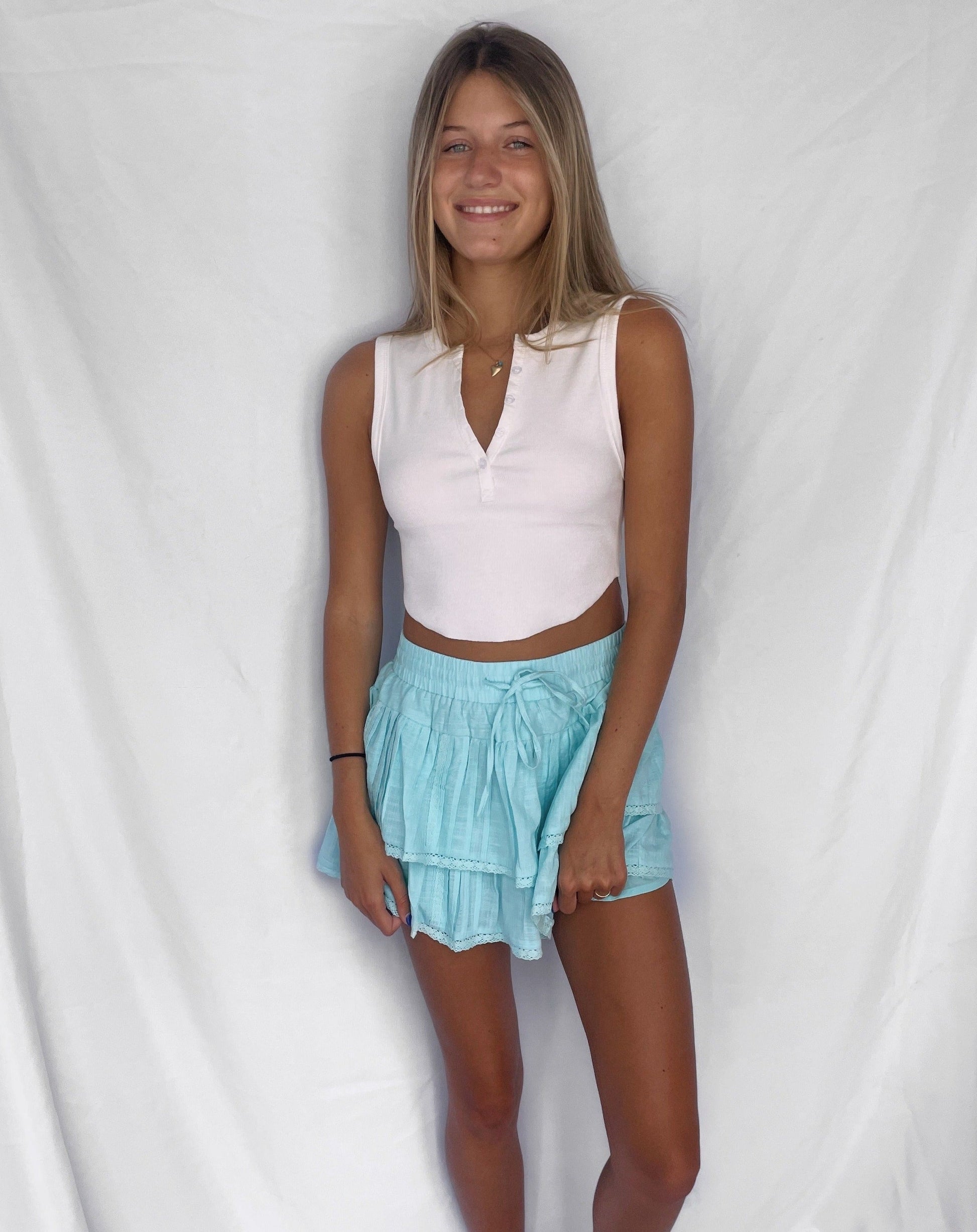 Get a level up on your essentials in our Better Than Basic Crop Top. This white crop top is the basic tank top with a little extra. And, yes, your friends will be totally jealous when you roll up in this adorable tank. Our newest tank features a buttoned v-neck with scooped hi-lo sides.